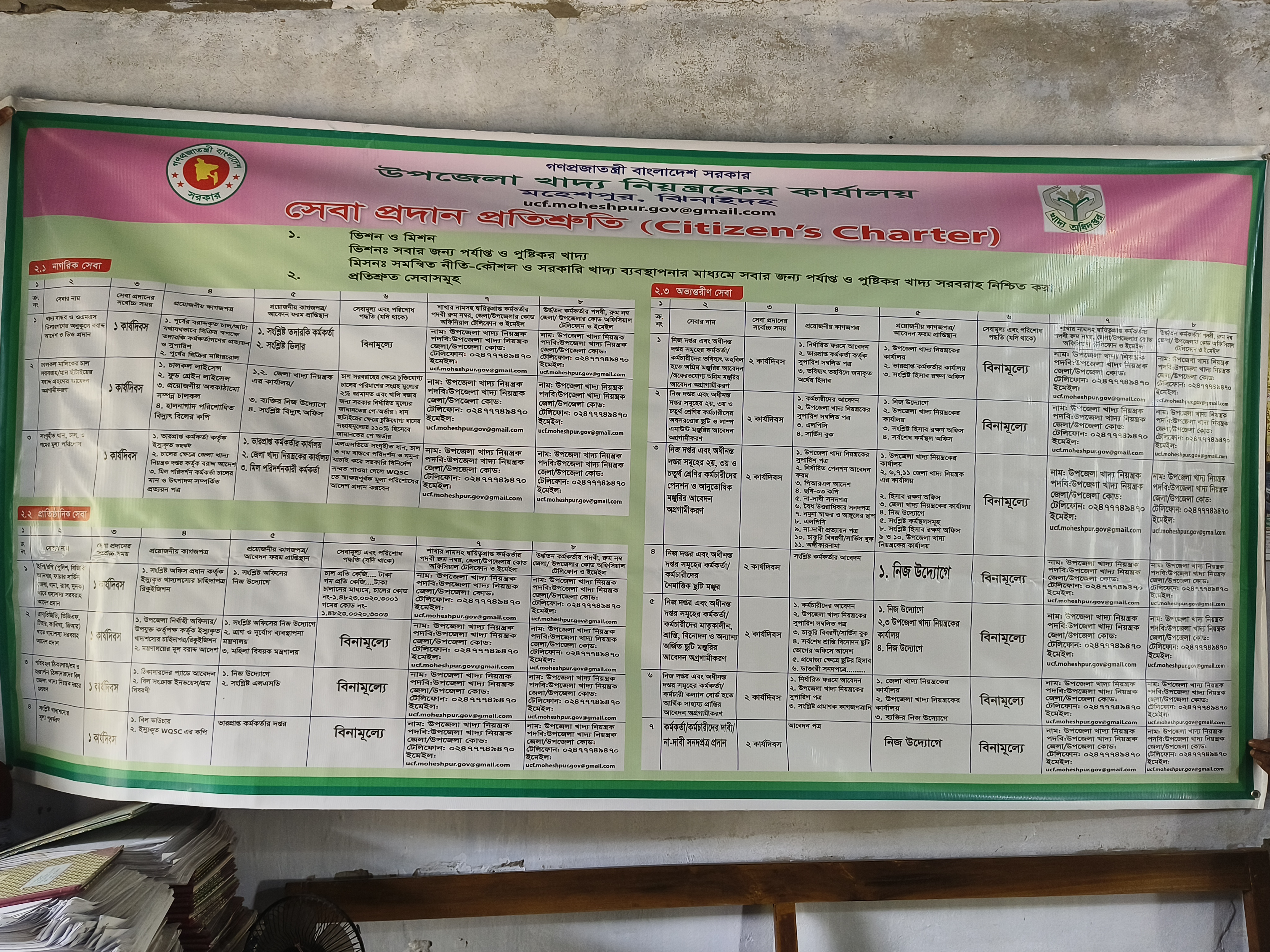 | ৮ | খাদ্যবান্ধব কর্মসূচিতে ১৫ টাকা কেজি দরে চাল বিতরণ | সেপ্টেম্বর-নভেম্বর, মার্চ-এপ্রিল | ১. খাদ্যবান্ধব ভোক্তা কার্ড | ১. সংশ্লিষ্ট উপজেলা খাদ্য নিয়ন্ত্রকের কার্যালয় | চাল প্রতি কেজি- ১৫/- নগদ অর্থে | উপজেলা খাদ্য নিয়ন্ত্রক, মহেশপুর, ঝিনাইদহ রুম নং- ৩৭-৩৮ ফোন: ০২৪৭৭৭৪৯৪৭০ ই-মেইল: ucf.moheshpur.gov@gmail.com | উপজেলা খাদ্য নিয়ন্ত্রক, মহেশপুর, ঝিনাইদহ রুম নং- ৩৭-৩৮ ফোন: ০২৪৭৭৭৪৯৪৭০ ই-মেইল: ucf.moheshpur.gov@gmail.com |
